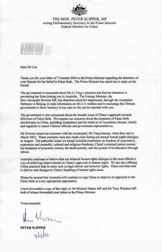 感谢您于2002年10月7日就您的未婚妻因信仰法轮功而被[江氏集团]拘禁之事致信总理。总理让我代表他给你回信。