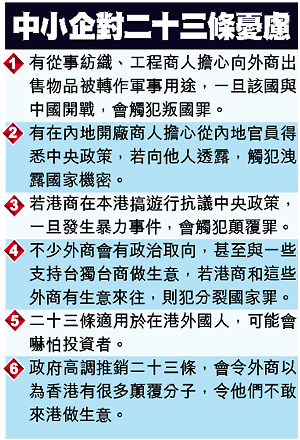 【明慧网2002年12月6日】苹果日报12月6日报导,继外商及外资银行公开表示对《基本法》二十三条立法感到忧虑后,连一直支持政府立法的中小企业商会,也对立法后会否影响营商环境感到忧虑,例如会否妨碍与外商、台商合作等。担心影响资金流动