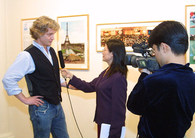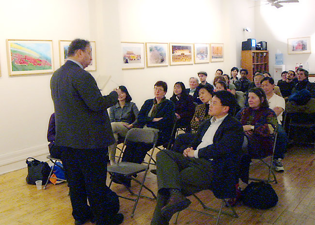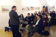| 媒体专家丹尼.谢奇特在做“人权、媒体和法轮功”演讲的开场白。 | 律师和画廊经营者山姆.以色列在接受当地媒体采访。 |