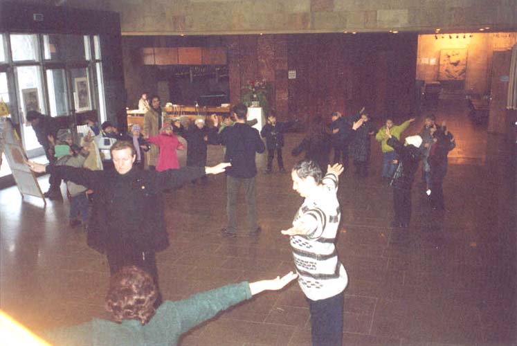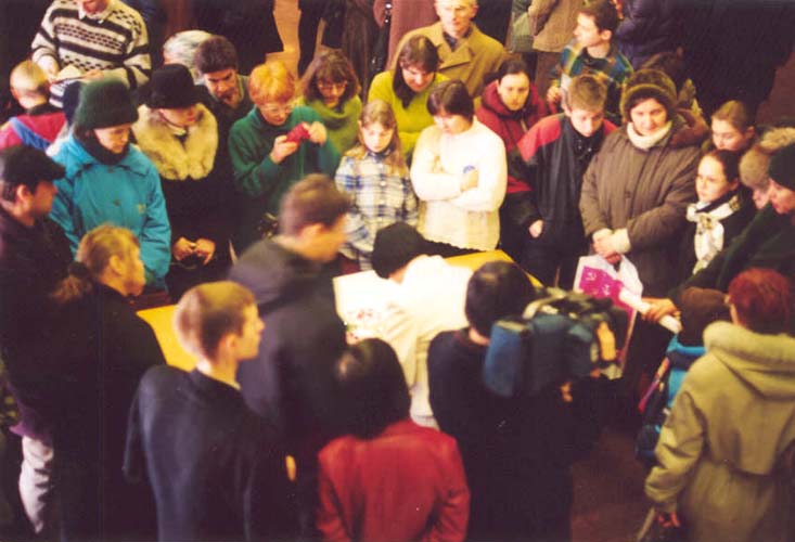 每天都有成百成百的观众前来观看画展。一个个学校老师带领孩子们来画展了解法轮功真相,纯洁天真的孩子们一看到学员们炼法轮功,他们就争先恐后跟着炼。他们个个争着拿法轮功资料。画展里放满了各种真相材料和正法之路的图片,学员们还放置了一台电视机在展厅里不断播放俄文的中国镇压法轮功真相。俄罗斯和乌克兰学员的不懈努力获得了很好的效果,成功的画展使众多媒体、政府和当地民众了解到了法轮功的真象。