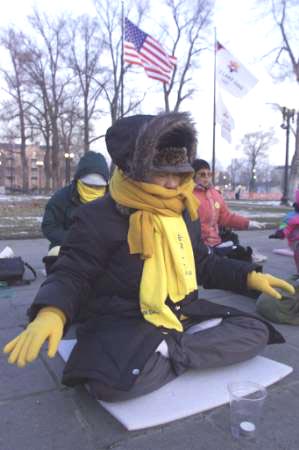 图:中国法轮功学员2月7日在盐湖城2002年冬季奥运期间的一次集会中打坐炼功。学员在星期四说集会是想告诉世界法轮功好,同时使人关注在中国法轮功学员遭受的残酷迫害。 (路透社/David Loh)