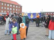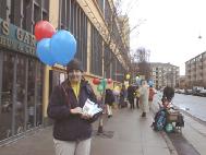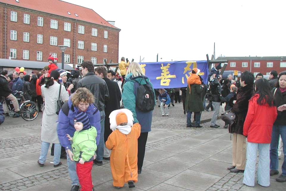 上午蒙蒙细雨中,丹麦大法弟子已开始在文艺表演举办地阿玛商业中心门外炼功,派发宣传品。还有很多丹麦青年帮助送发印有中英文“法轮大法”、“真善忍”的氢气球。在举办纪念会的会场内外,商场上下,整个地区,大人小孩都拿着氢气球。“法轮大法好”飘荡在整个地区。丹麦大法弟子在寒风中坚持一整天,直到天黑才结束。