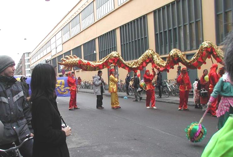 与此同时,在相距两公里的松比西广场上,由丹麦移民部长致词,并为龙头点睛,舞龙表演在上千的华人观看下,拉开序幕,继而舞上大街,开始丰富多采的游行。