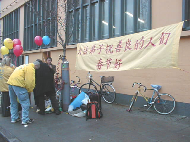 大法弟子们带上做成“红包”的真相光盘,以及中、丹文的真相资料,笑容可掬地向同胞们祝福一声“新年好!”并递上新年礼物。绝大多数的华人都是欣然接受。千余盘真相光盘和万份大法资料,在短短的几个小时内,都已到了同胞们的手上。不多时,我们手中的材料已是供不应求。