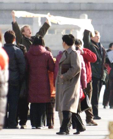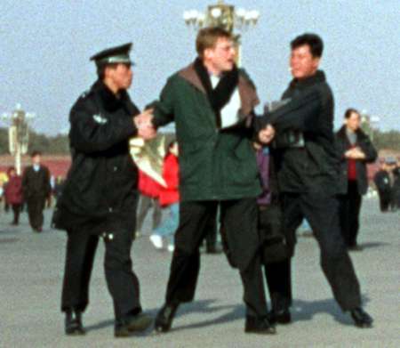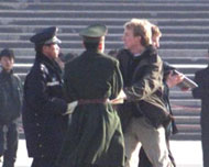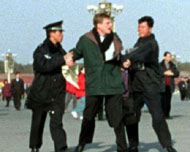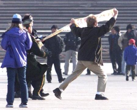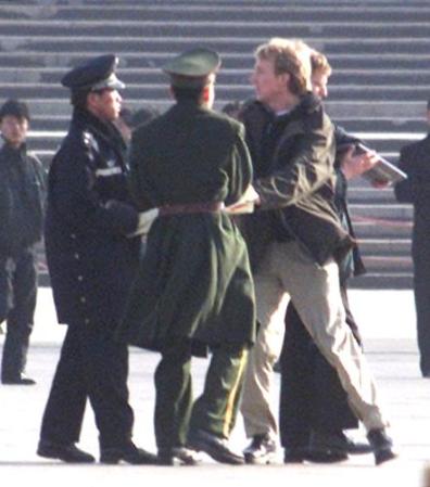 【明慧网2002年2月11日】北京时间2002年11日下午3点,来自北美的两位西人法轮功学员李伟.布莱迪(LEVI BROWDE)和杰森.劳福特斯(JASON LOFTUS)在天安门广场遭非法抓捕。这是第三起西方人因炼法轮功而在中国被抓捕的事件。到截稿为止,两人仍下落不明。在去天安门广场前,两人曾在广场附近的旅馆召开新闻发布会,揭示一年前除夕之夜发生的“天安门自焚”事件是由江泽民集团为诋毁法轮功而精心策划的。在新闻发布会上,来自美国的软件工程师李伟(LEVI)和来自加拿大多伦多大学的学生杰森(JASON)播放了北京中央电视台“自焚”事件片断的慢镜头,显示其中一位“自焚”者刘春玲是被一穿军大衣的人从后用硬物击打而死,并揭露整个“自焚”事件是江泽民集团为了镇压法轮功而制造的可怕构陷。(新闻发布会上播放的录像可在法轮大法信息中心网站下载:https://faluninfo.net/media/immol/AStagedTragedy_Eng_56k.ra ;镜像:https://media1.minghui.org/media/video/2002/02/11/AStagedTragedy_Eng_56k.ra
