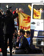 报导说,一组组的抗议者展开黄色横幅,高喊“法轮大法好!”,这次行动的目的是为了在布什总统下周访问北京之前,要人们更加关注中国对法轮功运动的镇压。数名抗议者,多数是年青男女,飞奔在辽阔的广场上,挥舞着横幅,高喊着口号,数百名身着制服的警察和便衣在后面追逐着。
