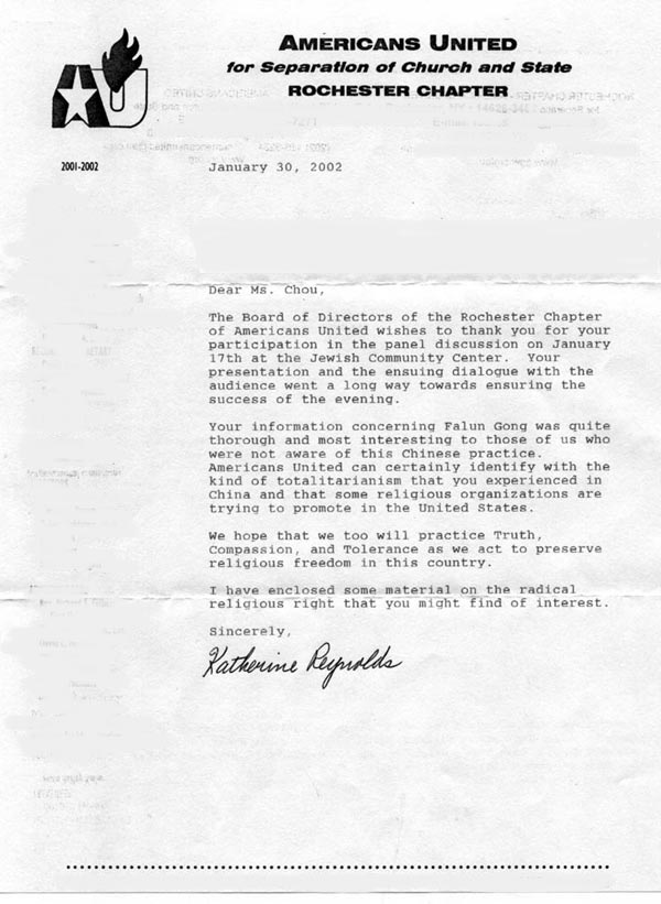 政教分立全美联合会罗切斯特分会的董事会成员们想借此感谢您参加1月17日在犹太人社区中心举行的专题讨论。您的发言及随后与听众的对话对当晚活动的成功起到了很大的作用。