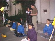 学员们2月14日下午六时在中领馆前举行新闻发布会;学员宣读了中英文的声明:呼吁社会各界人士关注这一事态:制止中国江泽民政权实施的国家恐怖主义,并且要求中国立即释放所有被捕的西人学员。随后,学员发正念以及炼功等。