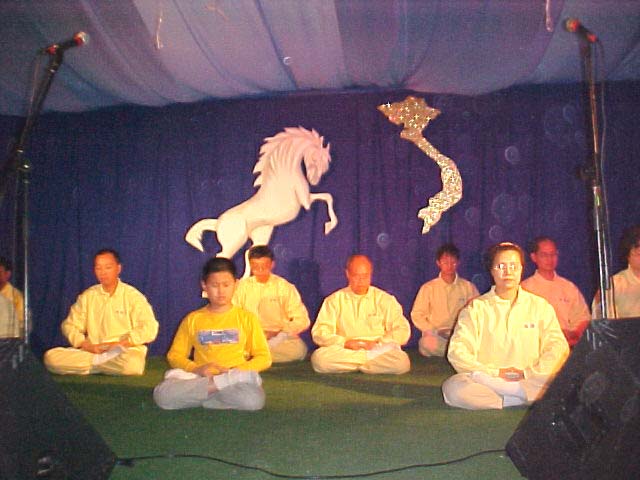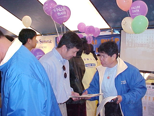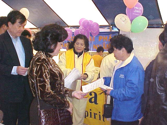 在游园会上,数千人群沿着各展位川流不息,法轮大法的展位格外引人注目,写有“法轮大法”的横幅高高悬挂在展位上方,投影机和电视机不停地播放真相故事,桌上摆满了有关大法的资料和真相资料,一份份真相资料送到游客手中,也有许多游客询问各种问题,大法弟子耐心地回答。在期间,也有各种节目在舞台上展示了越裔乡村风情;大法弟子也有机会在舞台向游客展示法轮功的五套功法,台下座无虚席,游客们被五套功法深深吸引,他们致以热烈的掌声。