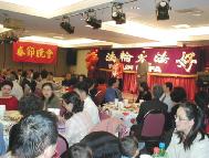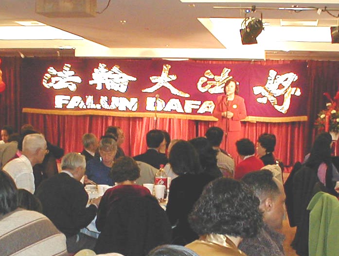 | 华府学员举办的新春联欢会 | 明慧学校校长于建梅会上发言 |