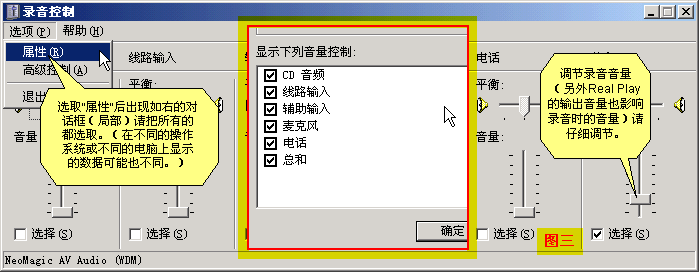 在录制声音时,为了尽可能地降低噪音,可以采用对其它放音设备进行“静音”的办法。方法是:按图三的说明,点“选项”→“属性”,点“调节音量”下的“播放”,在“显示下列音量控制”栏里,先把上面一半的项目选取,然后按“确定”。这时一边用Real Play放着录像,把声音尽可能放大一些,一边试着一个一个地选择“静音”,直到把所有的“静音”都选择一遍,如果选择过程中,声音突然没有了,就把那个选项重新打开(取消“静音”)。在试着进行“静音”的过程中,我最明显的感觉是当把“CD 音频”一静音的时候,背景噪音马上就少了很多,很明显的。用同样的办法再把另一半放音音量设备进行“静音”。(录制完成后最好把这些被手动“静音”的项目再取消静音,不然的话有可能其它程序或设备不能正常播放声音,如对“CD 音频”静音之后,在光驱中放入音乐CD的话可能放不出声音来。)