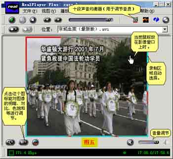 选到正确的录音音源后,在录制时就会看到如“图四”一样的彩条,那是录制的音量大小的动态显示。按“图三”的说明,仔细地调节录音音源的音量和Real Play的音量,使录像在最高的音量时,彩条也不要达到顶端,而要留有一定的余地。在正常音量情况下,彩条在不达到红区为好,当然最佳的选择还是用对此试听的办法来决定。