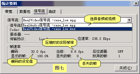 8、在Real Play中查看原始文件的数据流参数。点Real Play的菜单“视图”下的“统计资料”就进入如“图七”的界面。在“信号流”选项中有两个选项,分别是“音频”和“视频”选项。从中可以看到原始文件的“音频”的位率,“视频”的位率和帧率等参数。在“高级”界面中则能显示更详细的参数。了解这些参数能更好地选择录制时的参数。