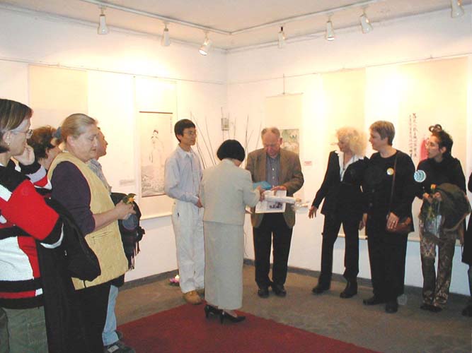 特拉维夫市的副市长为画展致开幕词。他说:“你用这种方式让人们了解你,这样的做法很好!感谢你把中国的艺术传播到这里,展示给以色列人民……”然后我向市长先生赠送了我的画,并向他赠送宝书《转法轮》。市长先生接过《转法轮》,久久凝视着,仿佛思绪万千。