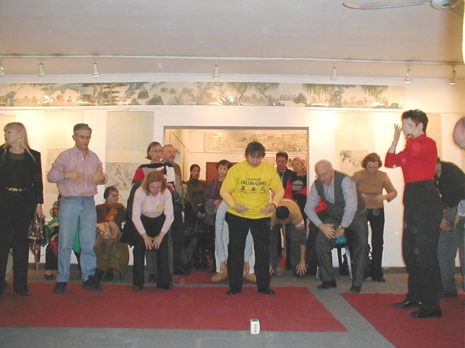 昨天,我去了耶稣受难的地方,来观光的人们悲痛地看着当年耶稣受迫害的刑具,人们的心在淌血。而今天,当这些参观画展的人们听到江泽民政府对敬仰神的人们,对信仰“真、善、忍”的好人残酷镇压屠杀时,人们的心同样在淌血。善良的中外人士被震撼了,他们良久不愿离去。有的人跟学员学炼法轮功,有的人在看真相电视,直到深夜十一点钟。虽是冬天,可是展厅里一阵阵强大的能量,使大家感到热呼呼的。学员们准备了几百朵鲜花,赠送给每一位来宾,祝福他们在对法轮大法的正确认识中走向美好的未来。