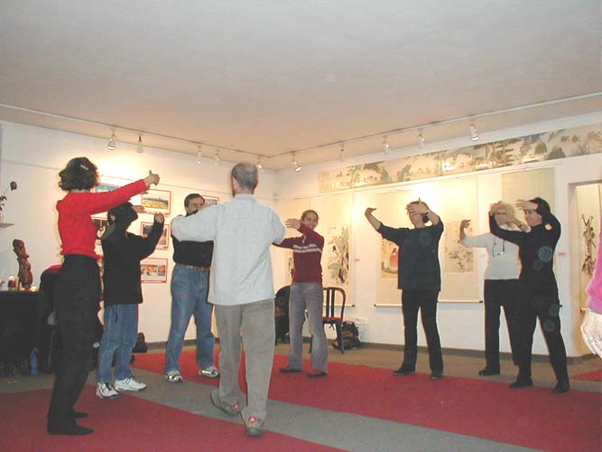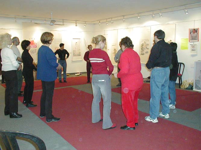 今天我们在拍照时她又来电话,约好6点钟来画展向我们学功。她特别聪明,很快把五套功法全学会了,而且马上就能双盘。她还采访了几位学员。临走时还真诚地请了《转法轮》回去拜读。