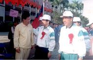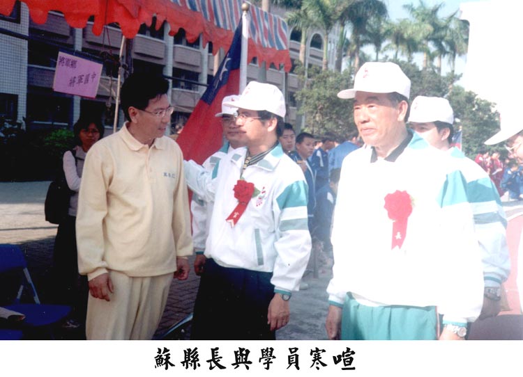 法轮功功法表演,被安排在第一个表演项目,台湾南区大法弟子发挥了粒子的作用,更有远自台中、彰化赶来的几位同修参与,为数约400余人参加此一盛会,全场气势如虹,动作整齐,场面慈悲祥和,带给全场70多所参加运动会的学校师生对大法的认识与了解而种下得法修炼的机缘。在表演当中,台南县苏县长莅临会场欣赏功法表演,表演后获得全场热烈的掌声,苏县长由县政府官员及学甲国中陈校长陪同绕场至法轮功的休息区与学员握手寒暄,县长说他已把《转法轮》看过一遍,现在在看第二遍了,他说他也要好好学一学。苏县长在今年1月底台南县寒假教师法轮功研习时也曾亲临研习会场致词。