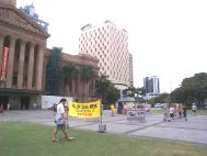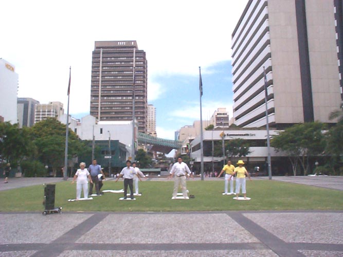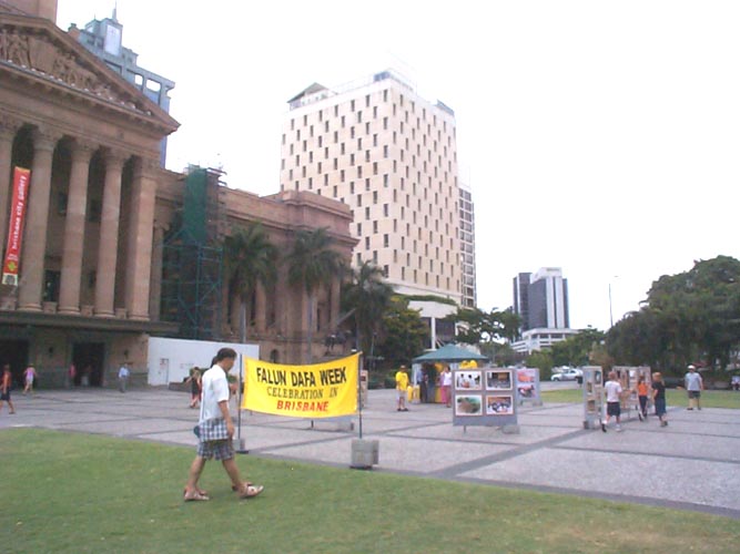 开幕式当天是布里斯本盛夏最热的一天,气温高达摄氏40度,因此,不少游人步入装有冷气设施的厅内避暑,正好观看大法图片展。市政厅外的学员不断向游人过客介绍法轮大法,其中包括许多中国大陆来的游客。学员向他们派发资料,讲清真相,还不顾灼热的阳光,向游人演示功法,活动一直延续到傍晚。晚上,学员们又在市政厅前举行了烛光守夜活动,与世界各地类似活动一起谴责中国近期对法轮大法弟子的又一轮逮捕、酷刑折磨、虐杀的暴行。