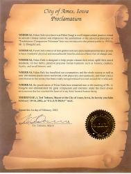 鉴于法轮大法修炼者们坚持李洪志先生的教导,并且他们在最艰苦环境下所表现出来的大善大忍已经触动了每一个善良人的心。美国爱荷华州爱美思市市长泰德.太达斯库(Ted Tedesco)宣布2002年2月10日至16日为“法轮大法周”。
