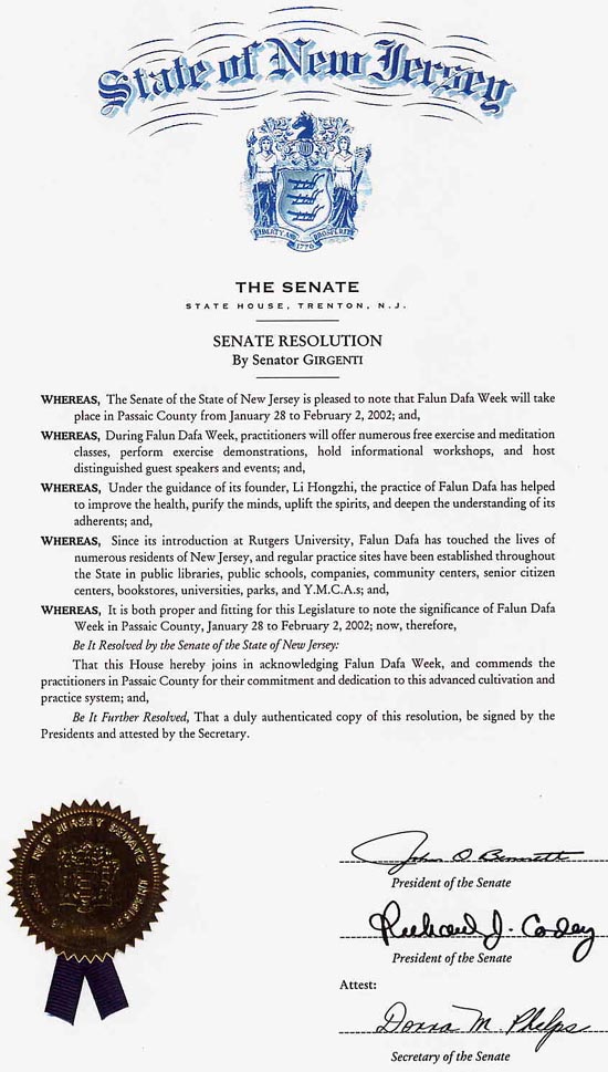 该决议由参议员格赞蒂(Girgenti)先生提议,在2002年2月2日举行的帕赛克县“法轮大法周”的庆祝仪式上正式宣读。