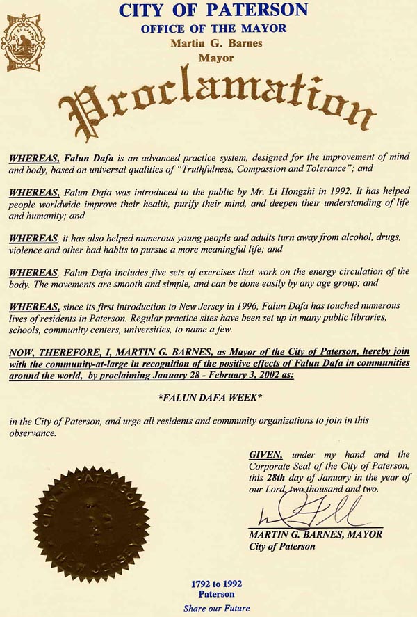 在褒奖令中,巴恩思(Barnes)市长同全社区一道,共同认知法轮大法对全世界所带来的积极影响,并号召全体市民和社区组织共同遵守2002年1月28日至2月3日为帕特森市“法轮大法周”的公告。