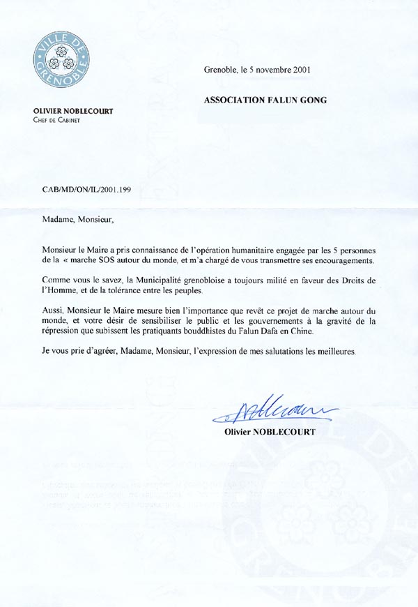 市长先生(亦为法国议员--译注)获悉五位参与SOS环球步行的人士的人道主义行动,责成我转达他对他们的鼓励。