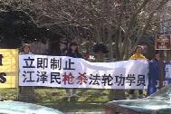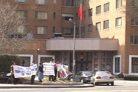 然而邪恶最怕曝光,江泽民集团闻知此事后,丧心病狂的下达对坚定的法轮大法弟子“杀无赦”的密令,全国各地“610”办公室正在决定判死刑和重刑的法轮功学员名单,这些名单包括以前遭到拘捕并仍被关押的法轮功学员。大华府地区的法轮功学员得知江泽民的血腥命令后,连夜赶制了“立即制止江泽民枪杀学员”等横幅,及相关讲真相资料,于3月7日上午在驻华盛顿D.C的中国大使馆前和平请愿,呼吁江泽民集团立即停止镇压法轮功,同时也希望善良的美国人民及世人了解事实真相伸出援助之手共同制止江泽民血腥的,疯狂的对中国法轮功学员的邪恶镇压。