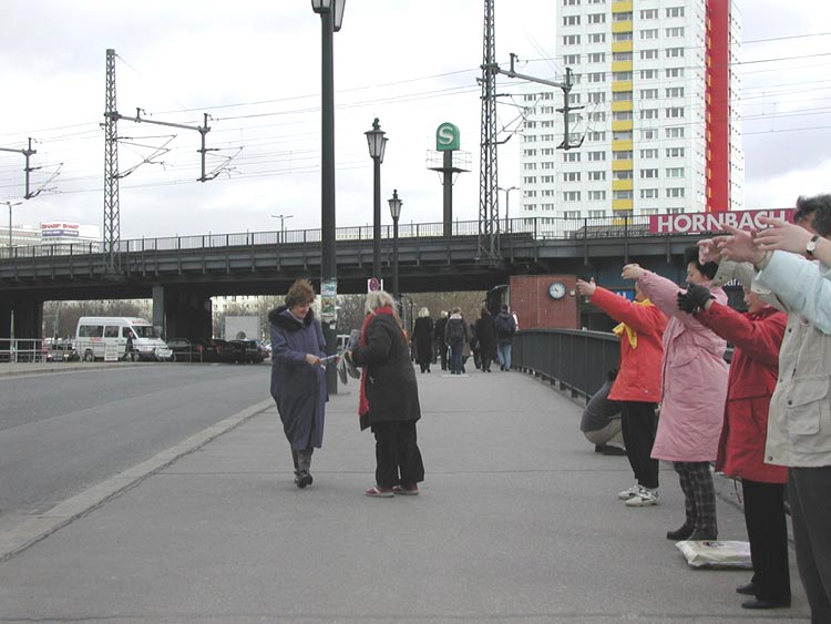 在附近大楼里工作的一位德国政府部门职员对我们说,他把从学员处借来的真相录像在他的朋友圈里传看。他又和我们聊了很久,提了不少问题,最后他真诚地祝愿我们成功。一个对法轮功的迫害几乎一无所知的德国女孩听了学员的介绍后觉得很难过。她主动要把学员介绍给她的教区的神父,并希望在后天星期日做礼拜时学员能去介绍法轮功在中国的迫害情况。