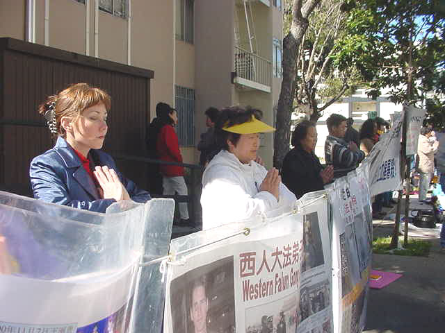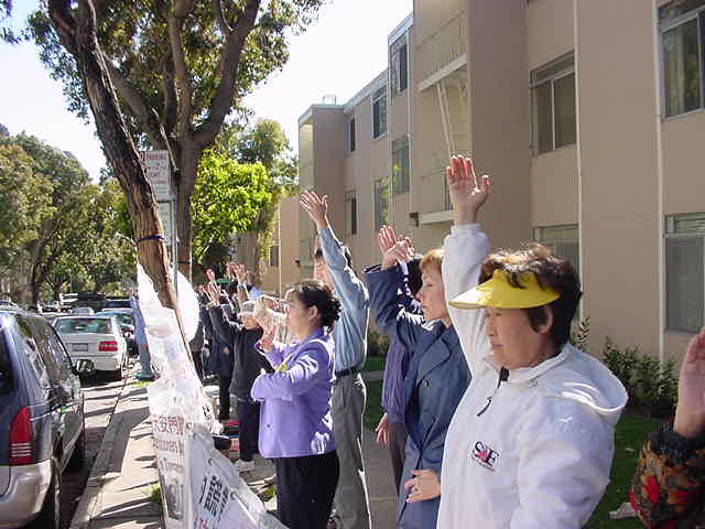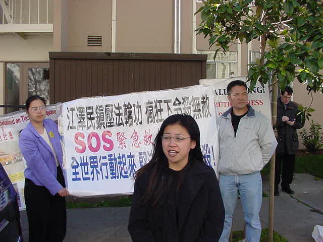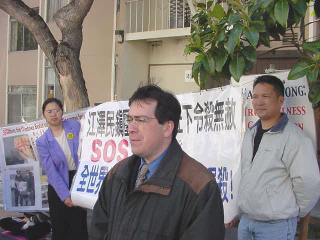 前不久在北京因不配合邪恶的非法拘捕而遭受毒打的湾区华裔法轮功学员李春泉以她个人的亲身经历讲述了江氏集团的残暴和欺骗本性。曾于去年11月份亲自上北京天安门打真善忍横幅请愿的西人法轮功学员亚当-兰宁(Adam Leining)也发言呼吁公众、媒体和社会团体采取紧急行动救援,防止因邪恶报复而可能产生的血腥屠杀。