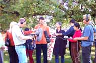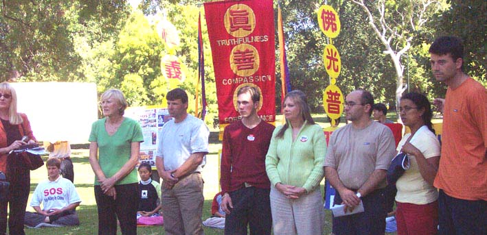 玛瑞琳.福特(Merilyn Ford)身披从北京带回来的“法轮大法好”的横幅,向记者表示,“我们在澳大利亚已经做了多方努力,但这场迫害仍在进行,妇女仍在劳教所被强奸,婴儿被吊死,最近居然发生了两起警察枪击张贴法轮功标语的法轮功学员的事。在这种情况下,我没有心情呆在澳大利亚打扮得漂漂亮亮地去参加舞会。当年希特勒曾告诉德国人说犹太人都该杀,我们能让那样的惨剧发生在二十一世纪的今天吗?”