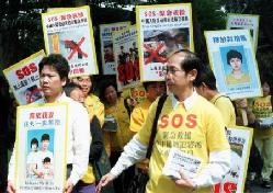 图:2002 年3月10日,星期天,在香港市区街道,香港人欧满乾(音译),左,同他的两个孩子举着他妻子吕柏凤的相片和一个上面写着“释放我的妻子,让我们家庭团聚”的牌子。星期天,一组法轮功炼习者在繁忙的街道上平静地游行至中国驻港办公室,请求释放两名香港法轮功成员,包括上个月在大陆被拘捕的吕柏凤。(美联社图片 Lo Sai Hung)