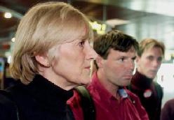 图:2002年3月8日,星期五,前澳大利亚奥林匹克获奖者简.贝克,左,同另外两个澳大利亚法轮功学员与记者在新加坡樟宜机场谈话。星期四,她同另外九人在北京举行了一个简短的抗议后被扣留。贝克说,国际奥林匹克委员会错过了在2008年奥林匹克比赛之前强迫中国(江泽民)政府改进他们人权纪录的机会(美联社图片Ed Wray)