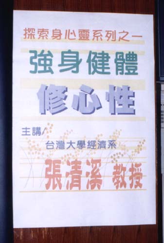 【明慧网2002年3月15日】台中图书馆「九十一年春季大众科学、教育文化讲座」于三月二日展开。首场演讲由图书馆科教中心与法轮功研究学会合办,请到台湾法轮功研究学会理事长,同时也在台湾大学经济系任教的张清溪教授,主讲「探索身心灵系列之一:强身健体修心性」。当天盛况空前,国立台中图书馆一楼的演讲厅座无虚席,连二楼的副厅也满座。馆方的工作人员及帮忙的义工们都很讶异,「法轮功」到底有何魅力,竟能吸引那么多的听众?