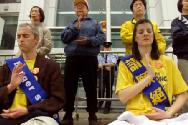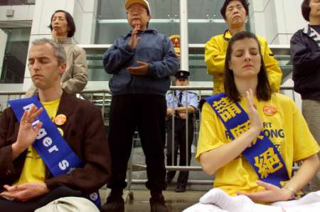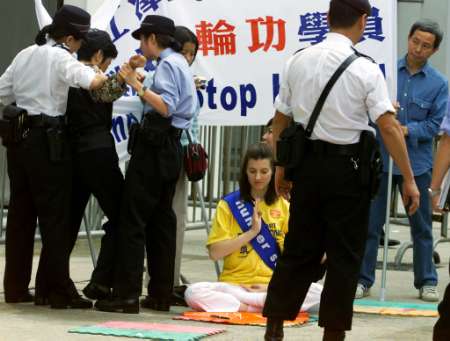 2002年3月14日,当一名当地修炼者(左)在香港中联办外进行绝食抗议而被警察带走时,西蒙史雷格(Simone Schlegel) (中间),一名来自瑞士的法轮功修炼者正在打坐。星期四,一组瑞士法轮功成员与在香港当地的追随者举行抗议,敦促中国停止镇压该被取缔的精神运动。(路透社/ Bobby Yip)
