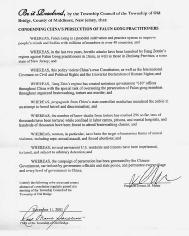 新泽西州米多赛克斯郡老桥镇通过决议,谴责江泽民集团对法轮功学员的迫害