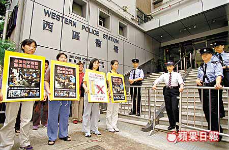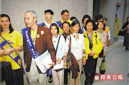 【明慧网2002年3月17日】苹果日报3月16日讯,警方首次对法轮功学员作出刑事起诉,前日在中央驻港联络办公室门外绝食静坐,遭警方以阻街为理由强行抬走的十六名本港及瑞士法轮功学员,昨日被落案控告在公众地方摆放横额(横幅)及绝食造成阻碍两项罪名,在西区裁判署提堂。裁判官唐文批准四男十二女被告以五百元现金保释候审,条件是不得离开香港,案件押后本月二十二日再提讯。