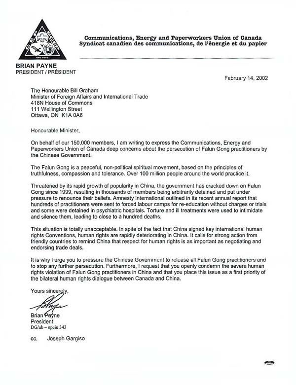 我代表加拿大通讯、能源、造纸业工会联盟的十五万成员,写信向您表达我们对中国政府迫害法轮功修炼者的严重关注。