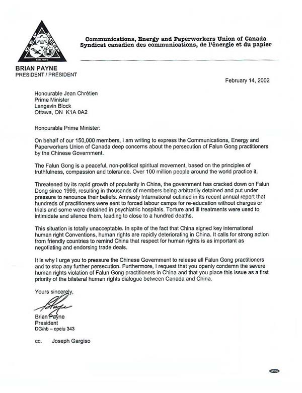我代表加拿大通讯,能源,造纸业工会联盟的十五万名成员,就中国(江泽民)政府迫害法轮功学员一事,写信向您表达我们的深切关注。
