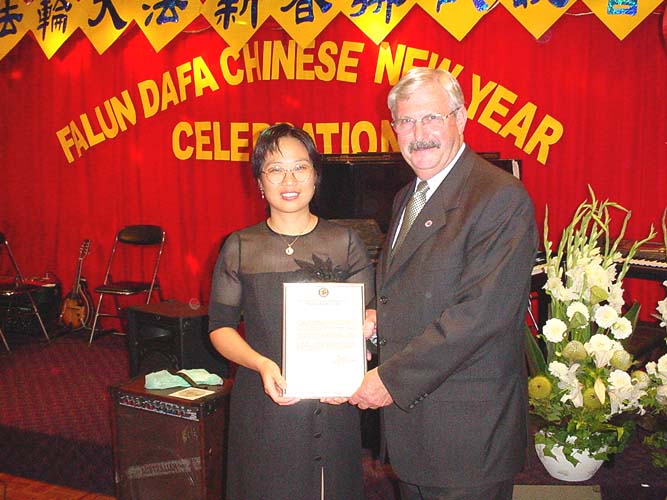 由衷地感谢法轮大法在身心两方面对我们社区作出的贡献。欢迎法轮大法继续合作并参与社区各项活动。衷心祝福二○○二年二月二十八日的法轮大法日”。