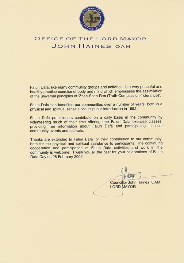 澳洲悉尼帕拉马塔市(Parramatta)市长约翰-汉那斯(John Haines)在百忙之中亲临法轮大法新年联欢晚会以尽地主之谊,并借此良机表彰法轮大法。褒奖书中他说: