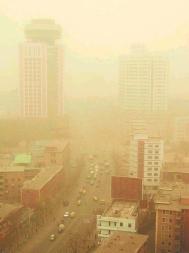 记者在市区随机采访感觉到,从下午2时40分开始,明媚的阳光不见了,天空中飘浮着淡淡的土腥味。到了下午4时,天空沙尘弥漫,街面建筑物笼罩在一片黄色的沙尘之中。行人纷纷躲避,匆匆赶路。不少行人带上了口罩,有的头上罩上了塑料袋,以避沙尘。到5时许,能见度逐渐减弱,过往车辆都打开了车灯。