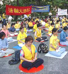 趁着日内瓦举行人权会议,香港法轮功学员二十一日在香港中环遮打花园静坐练功,希望国际间关注中共(江泽民)对法轮功学员施压,以及要求中共当局释放法轮功学员。(中央社记者卢健辉香港传真 三月二十一日)