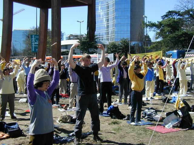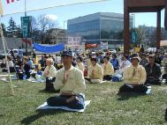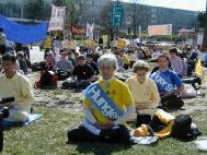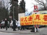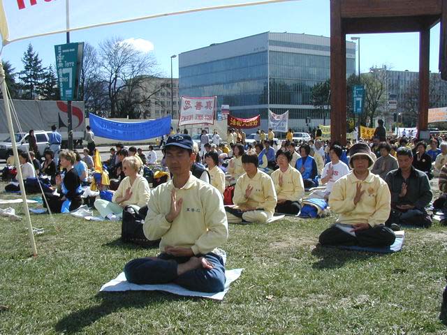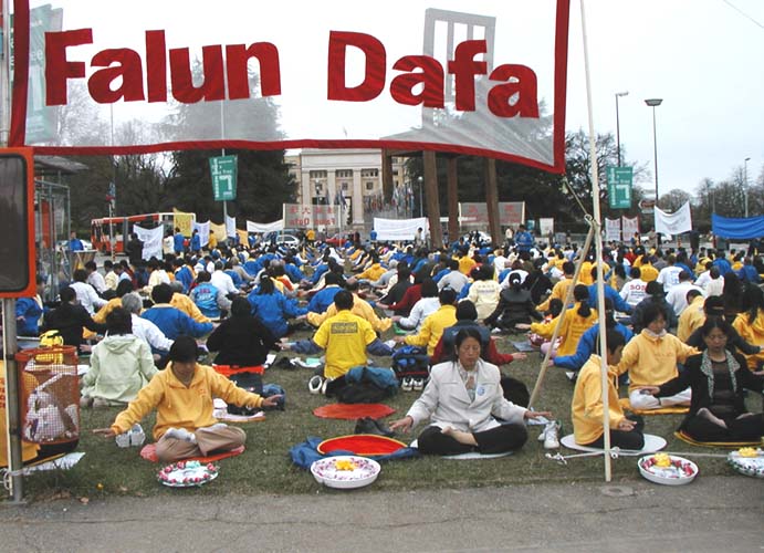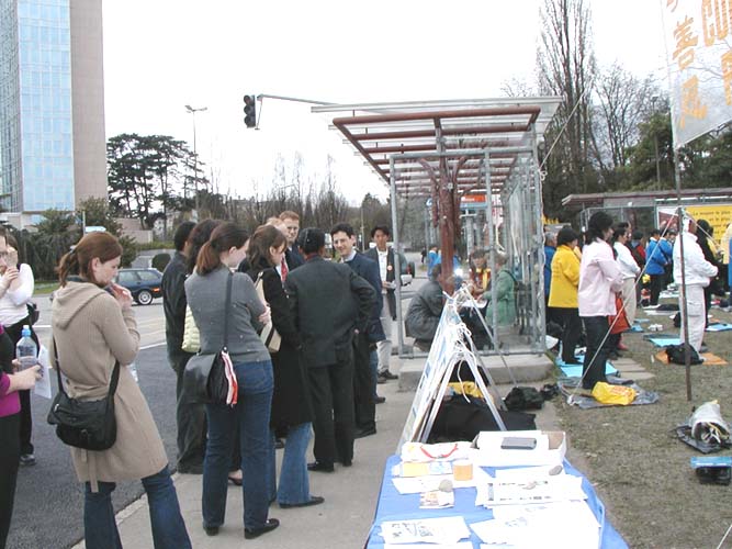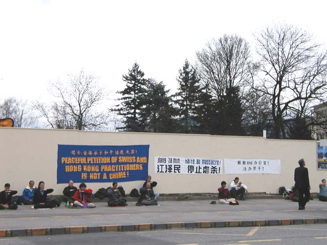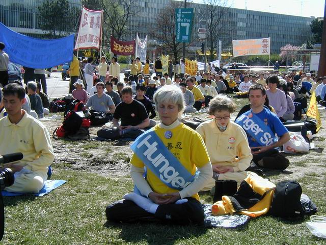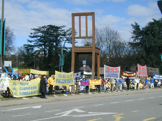从世界各地远道而来的700多名法轮功弟子与昨天一样在广场上静静地打着横幅、或炼功、或学法、或发正念。祥和强大的正念之场在影响着日内瓦,每个弟子都在这个整体中提高、升华着。他们中有81岁的、从来没出过国的老大妈;有牙牙学语不满周岁的孩子;有专程从澳洲赶来的母女俩,她们的亲人──孩子的父亲被中国江泽民政权迫害致死,如今只有怀抱亲人的骨灰盒来这里请愿;他们中还有坐着轮椅的瑞典学员;还有刚从中国监狱被释放出来的饱经酷刑折磨的加拿大学员……