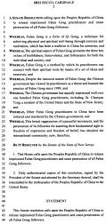 本参议院决议案要求中华人民共和国政府释放被监禁的法轮功学员及停止对所有法轮功修炼者的迫害