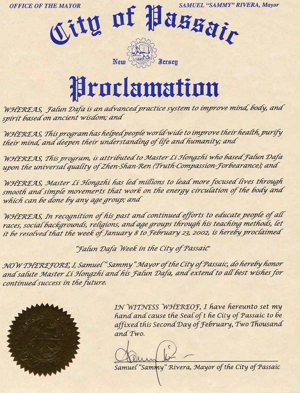 在褒奖令中,黎五乐市长赞扬法轮大法帮助世界各国的人们改善了身体健康,净化了思想,提升了精神境界,加深了人们对生命与人生的理解;称赞李洪志大师通过教导人们修炼动作舒展简单,能促进身体能量流动,适合任何年龄层的人士学炼的功法,帮助了数百万人过上了更有意义的生活。为了表彰李洪志大师对各种族,各社会背景,各宗教,和各年龄层人士的教诲和所付出的努力,黎五乐市长特宣布2002年1月28日至2月3日为“帕赛克市法轮大法周”。最后,黎五乐市长向李洪志大师和法轮大法致意,并最衷心地祝愿大师在未来继续取得成功。