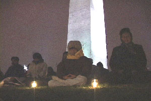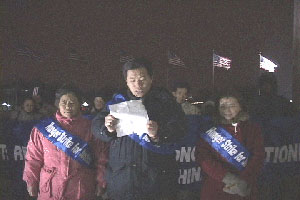 自从长春有线电视台播出法轮功真相事件发生后,丧心病狂的江泽民集团下达了“杀无赦”的邪恶命令,内部消息透露,目前长春弟子已经有超过5000人被捕,多人被虐杀。情况万分危急。整个请愿活动从3月26日开始,将在纪念碑前持续6天。3月27日一早,几名学员就开始了绝食请愿。晚8点,30余名华盛顿和外州赶来的大法弟子在华盛顿独立纪念碑前举行烛光守夜活动,呼吁国际社会共同制止江泽民对长春弟子的新一轮大清洗。绝食弟子宣读了一份绝食声明,声明说: