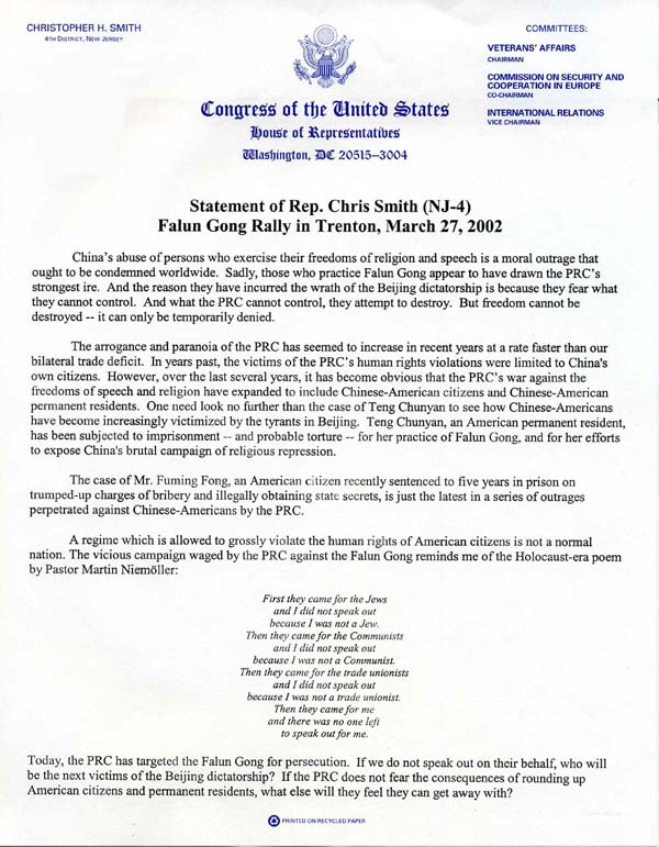 一个允许对美国公民的人权严重侵犯的政权不是一个正常的国家。中国反对法轮功的邪恶斗争使我想起了马丁.尼莫拉(Martin Niemoeller)牧师的一首关于纳粹大屠杀时期的诗: