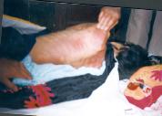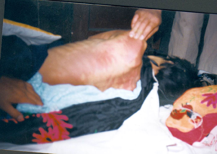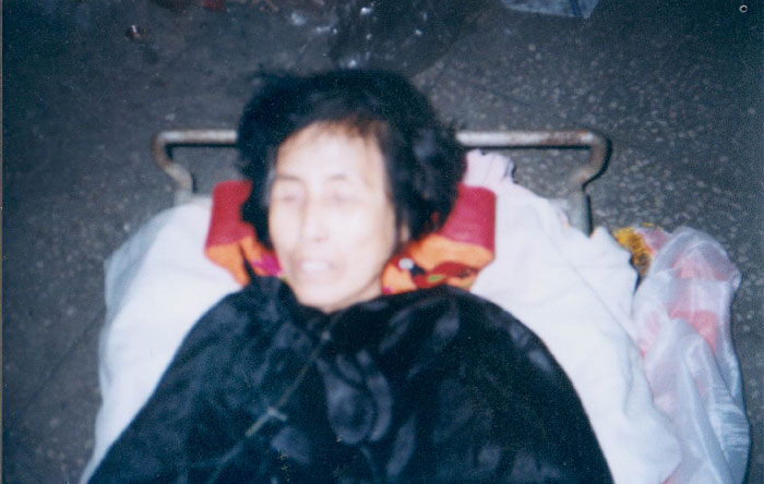 回想二零零一年二月十九日我们听到李艳华老人不幸的消息,大法弟子悲愤万分,决定去太平间验伤。揭开老人的衣服,老人后背、腰部以下颈部肩头胳膊上都是一条一条紫色的伤痕,伤痕重叠处是一片一片的,可见当时老人遭受了怎样的毒打!惨不忍睹啊!而且大法弟子拍照时李已被整容,换上了干净的衣服,但是老人鼻孔仍留有大块血迹,未清洗干净。糖尿病鼻孔还要流血吗?这就是“非暴力死亡”?在这里需补充的是,观众看到的照片上李艳华的后背是红色的,不知录制时作了怎样的手脚。且电视分辨率有限,实际照片上是一条一条紫色伤痕。