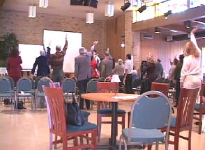 最有趣和感人的是,我们计划最后有十分钟的功法表演,没想到所有的人连同主持人都站了起来,随着录音机里传出的师父的口令,模仿着学员们的动作认真地学了起来。整个场面很是让人感动。让我们感到更应在法上精进,抓住一切讲清真相的机会,因为那么多生命都在等着法!