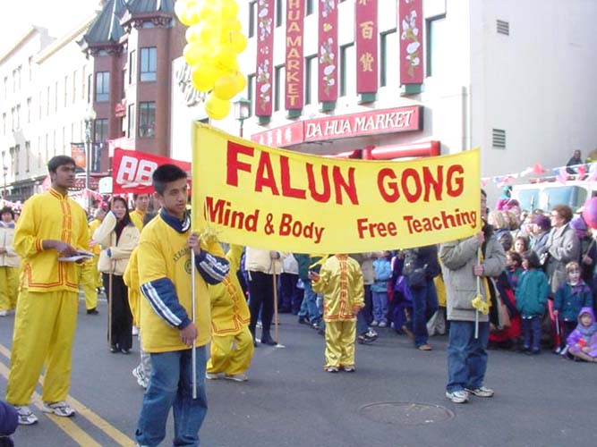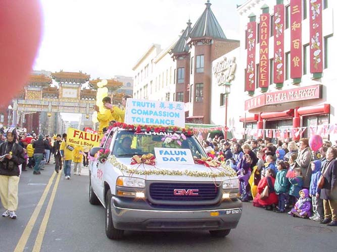 游行的队伍中,法轮功学员及明慧学校的队伍声势浩大。在弟子精心布置的花车上,有西方学员和小弟子们不断地展示五套功法。整齐的队伍及祥和的音乐又一次把‘真善忍’带给了华府大众。我们数位年轻女弟子,被主办单位特别邀请,身着各朝服装,走在游行队的前端,成为镁光灯的焦点。次日报纸还特别提及。